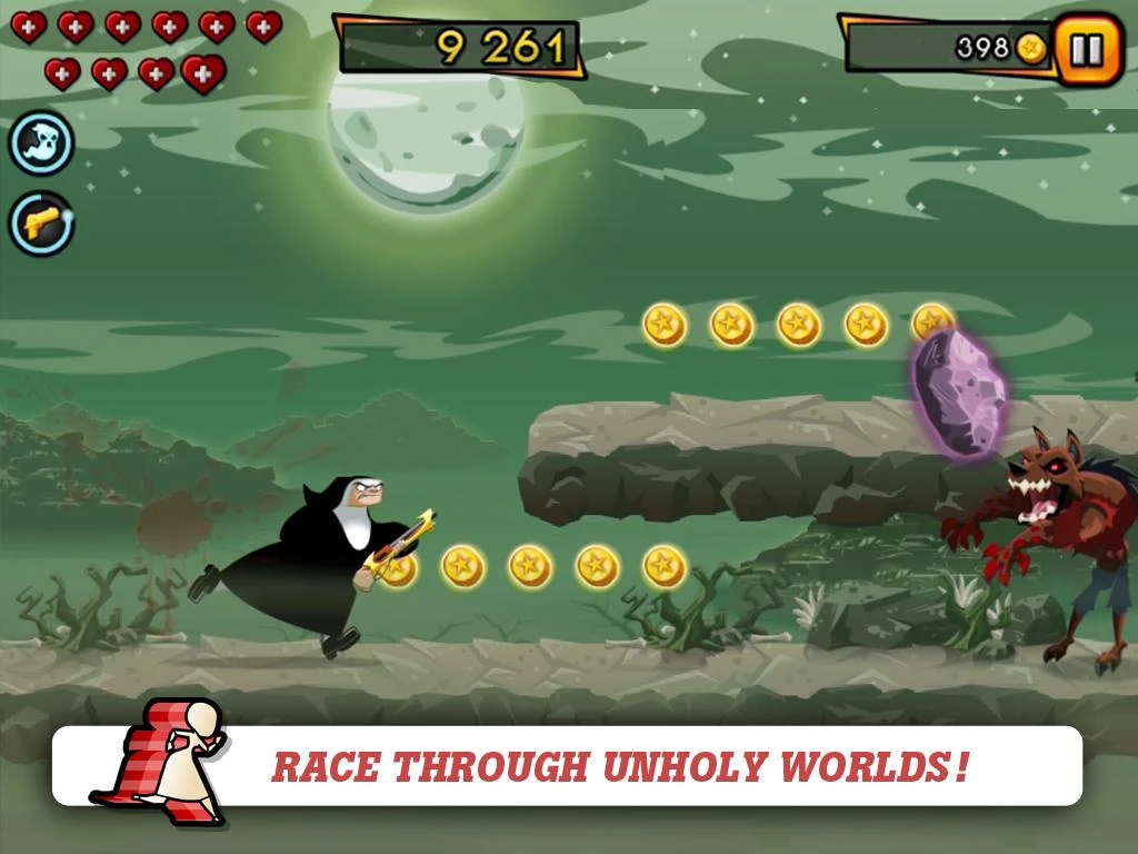 มาอีกครั้งกับเกมส์แม่ชีขาลุย ที่เมื่อเกมส์ที่แล้วพวกเธอเป็นแม่ชีนักวางแผนการรบ กลับมามารอบนี้เธอเป็นแม่ชีนักวิ่งเสียแล้ว แล้ววิ่งเร็วด้วยสิ โดยการเล่นเกมส์แม่ชีภาคนี้นี้ เหมือนเกมส์วิ่งทั่วไปบนมือถือ โดยในการวิ่งนั้น จะมีการยิงพวกผีโครงกระดูก ปีศาจที่ดาหน้ามาตามทาง เพื่อไปให้ไกลที่สุดเท่าที่จะวิ่งได้ โดยจะมีตัวละครหนึ่งตัวให้เล่นฟรีๆ ถ้าอยากเล่นตัวอื่น ต้องเล่นเกมส์ เพื่อเก็บเหรียญไปปลดล็อคตัวละครอื่นเอา โดยแต่ละตัวก็ราคาแตกต่างกันออกไป