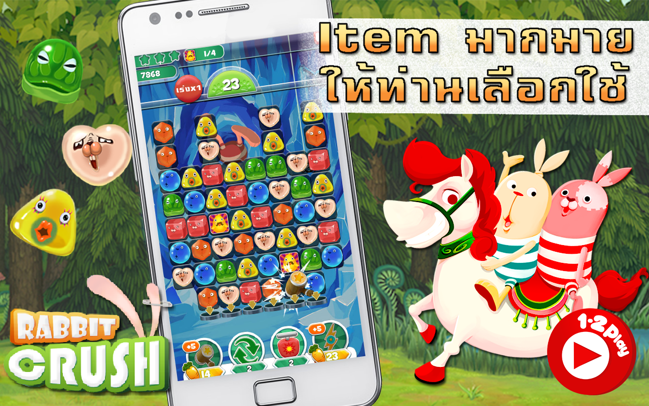 Rabbit Crush เป็นเกมส์ที่อาศัยบรรยากาศในการ์ตูน usavich ที่เป้าหมายของเกมส์คืออพาเจ้ากระต่ายสองตัวนี้หนีออกมาจากคุกให้สำเร็จ โดยการเล่นเกมส์นี้ เหมือนเล่นเกมส์ Candy Crush Suga เลย มีข้อกำหนดในแต่ละด่านว่าจะต้องทำภารกิจแบบไหนจึงจะผ่าน มีการใช้ไอเท็มเป็นตัวช่วยในการเล่นในด่านที่ยากๆ มีภารกิจให้ทำในแต่ละด่าน อาทิ เช่น เรียงหน้ากระต่ายครบ 15 ตัวก็จะผ่านด่าน ทำคะแนนสูงสุดที่กำหนดไว้ในแต่ละด่าน โดยจะมีจำนวนครั้งในการลาก หรือเรียกว่า Step กำหนดไว้