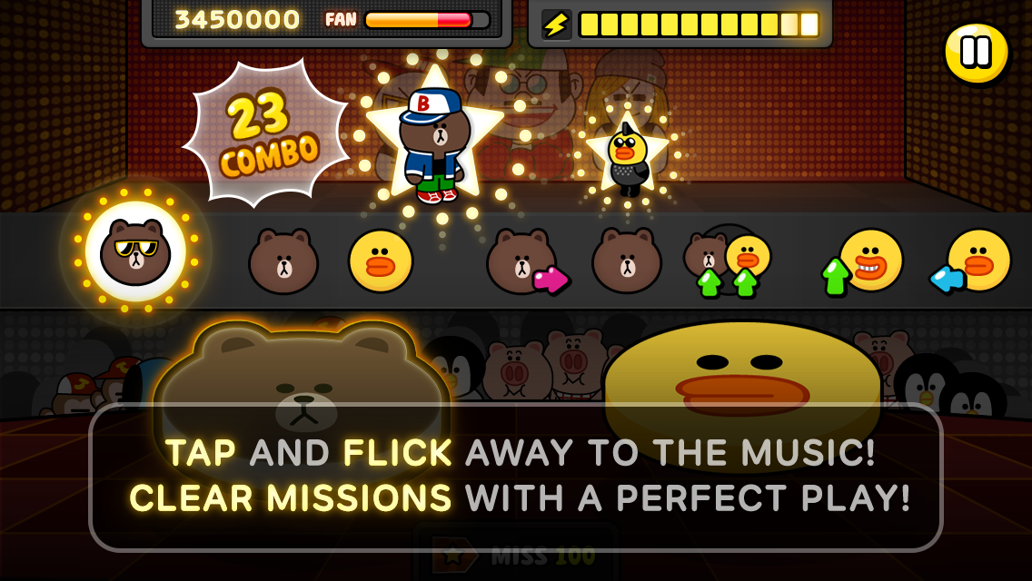 มาเล่นเกมส์เต้นฉบับเพื่อนไลน์กันจ้า เกมส์นี้เพื่อนจะต้องพา ดาราดังอย่าง หมี Brown กระต่าย Cony เจ้า กบ Leonard และเจ้าเป็ด Sally ไปแก้แค้นเจ้าเพื่อนทรยศ และไปให้ถึงความเป็นซุปเปอร์สตาร์ขาแดนซ์ให้ได้ ด้วยการทำภารกิจพิชิตแฟนๆทั้งหลายด้วยทวงท่าแันสุดแนว ในเกมส์เพื่อนๆจะต้องกดปุ่มให้เข้าจังหวะ ซึ่งปุ่มจะเป็นรูปหน้าของตัวละครนั้นๆ และเพื่อนๆจะต้องอาศัยทักษะและไหวพริบเพื่อจะกดปุ่มเหล่านั้นให้ได้ ยิ่งเพื่อนไม่พลาดและทำคอมโบได้มากเท่าไหร่ ก็จะได้แต้มและแฟนๆมาเท่านั้น